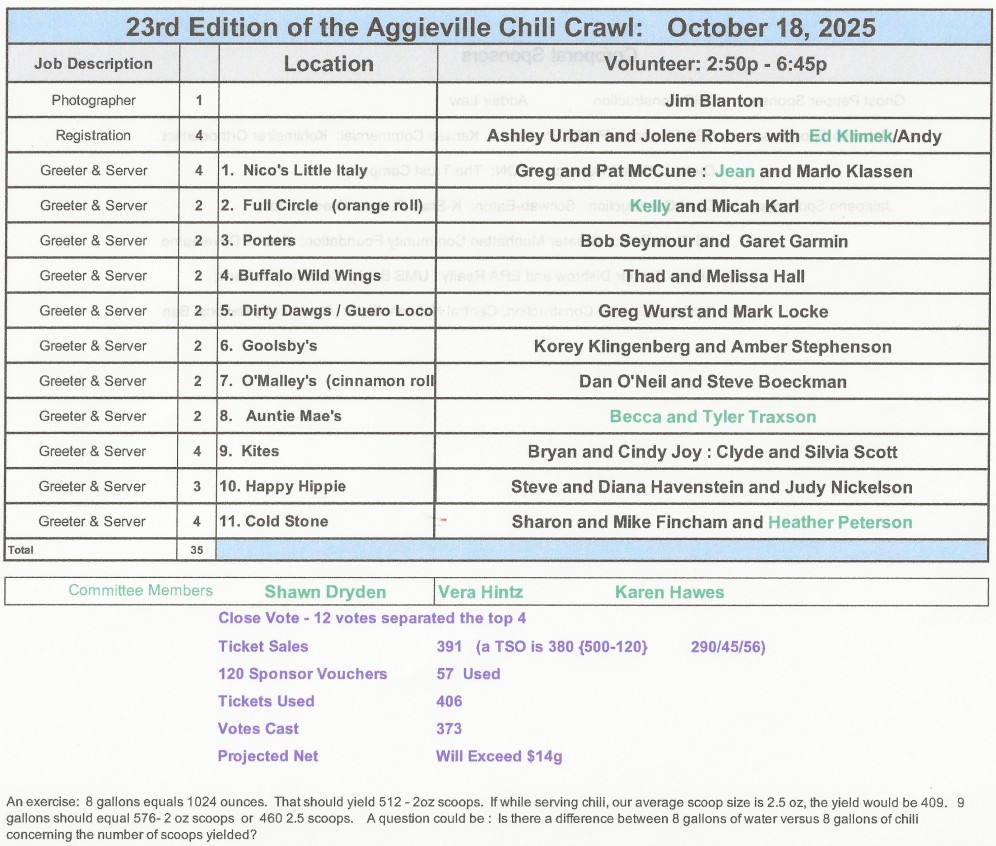 Bill Wisdom updated the group on the 23rd Chili Crawl held last Saturday. Thirty-five Optimist volunteers helped with the Chili Crawl. He also thanked the members on the committee (names in green). The winning chili was at Nicos Little Italy and only twelve votes separated the top four chili entries. He couldn't remember it ever being that close. Nicos added a little pepperoni to their chili which made it unique. We sold 391 tickets and gave 120 comp tickets to sponsor businesses and 57 were used. 406 ticket holders went through the Crawl and 373 votes were cast. Revenue should be about $14,000.