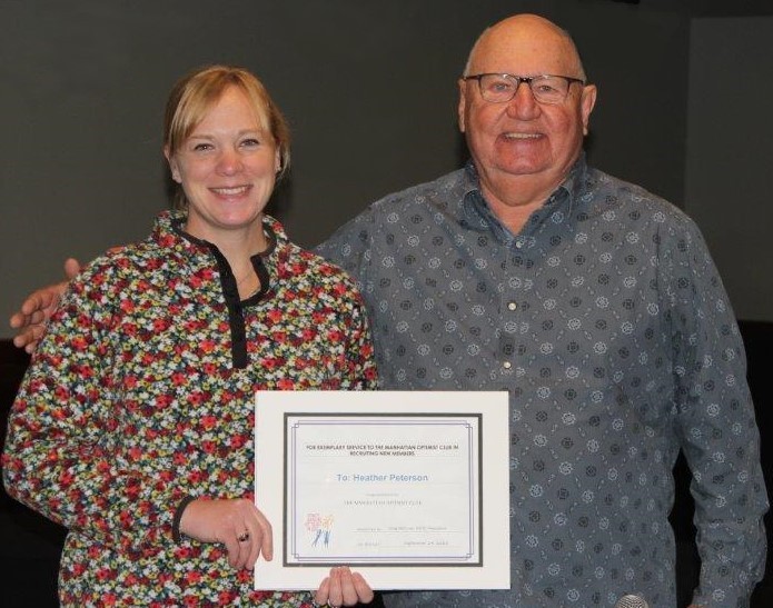 Heather Peterson received an award from Past President Greg McCune for being involved in recruiting five new members to the Manhattan Optimist Club.