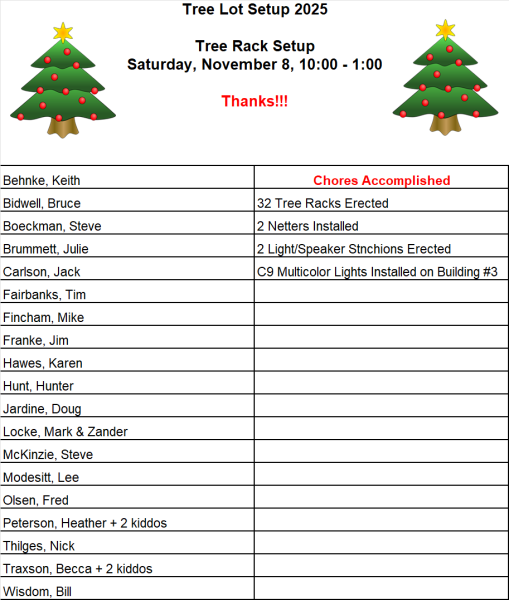 This is the 67th year of tree sales. The fundraiser began in 1958 by selling Christmas trees from a flatbed trailer. The tree lot was at Long's Park from many years and was then moved to Optimist Park.Major milestones include Bruce ordering 763 trees in March; we are unable to purchase any additional trees due to limits of our supplier. Wreaths, swags, and garlands, as well as other inside inventory has been ordered. Brad Horchem and Bryan Joy helped repair the stanchions. Bruce and Jim have completed winterizing the park. The softball coaches were able to help take the nets down and store them. The lights still need to be put up. The netters and the stanchions are up and they are still working on the inside sales area. Marlene Franke, Pat Bidwell, and Jean Klassen will set up Santa's Workshop on the 18th.