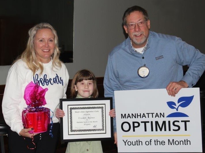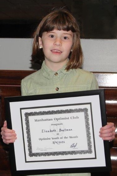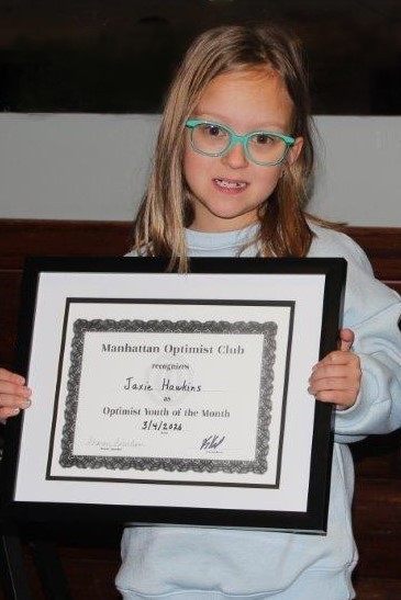 Sharon Fincham had the privilege of introducing our final student, Jaxie H, a 3rd grade student from Bluemont Elementary. The SPED team had the following to say: “ We are proud to nominate this outstanding third grader for the Manhattan Optimist Youth of the Month. Jaxie demonstrates perseverance, a strong work ethic, and a commitment to growth in everything she does. Through steady effort, she has made meaningful progress in her academic skills and continues to approach challenges with determination and a positive attitude. She encourages others, is always willing to help and brings optimism to the classroom each day. She truly embodies the spirit of this award.”