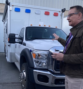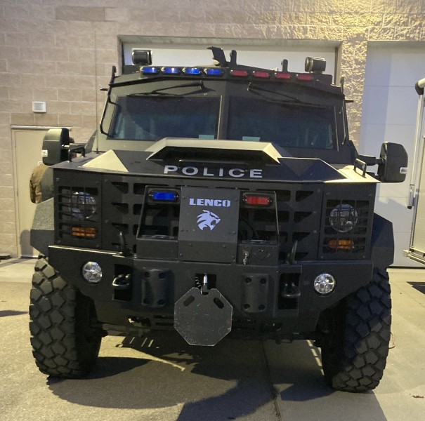 The group moved outside to view three specialized vehicles. The first is their Bearcat armored bullet resistant emergency vehicle. The vehicle was paid for by asset forfeit procedure. They use the vehicle when they have someone who is a high-profile target such as when they commit a violent crime, are in a standoff, and they also support other departments in the region for those needs. They have had it for five years and it was specially made for that purpose. There are a lot of different devices on it including a battering ram and a shield to protect an officer in a firing position on top of the vehicle.