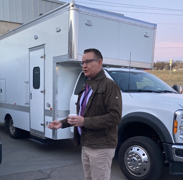 The second vehicle is their bomb truck. They are one of the regional agencies that have a true bomb team; the team members attend training and are nationally certified. They use it every single KSU football game because it is a requirement; they go out and inspect the stadium before games. The bomb team travels around the area to assist other agencies. Last week they assisted the Salina Police Department with a pipe bomb incident. The team will disarm it, destroy it in place, or take it out to the RCPD range and destroy it.