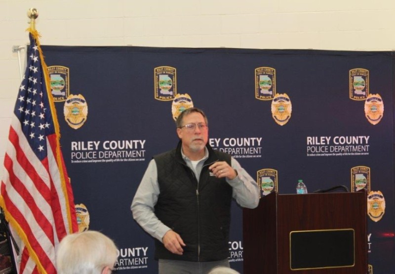 Erin welcomed the Optimist to “our garage” where we had breakfast. The Riley County Police Department has about 425 employees, and Director Brian Peete runs it like a CEO. The RCPD has its own IT, budgeting, human resources etc. The also have the jail and have about 110-120 inmates. They have 113 officers at the RCPD who keep the community safe.
